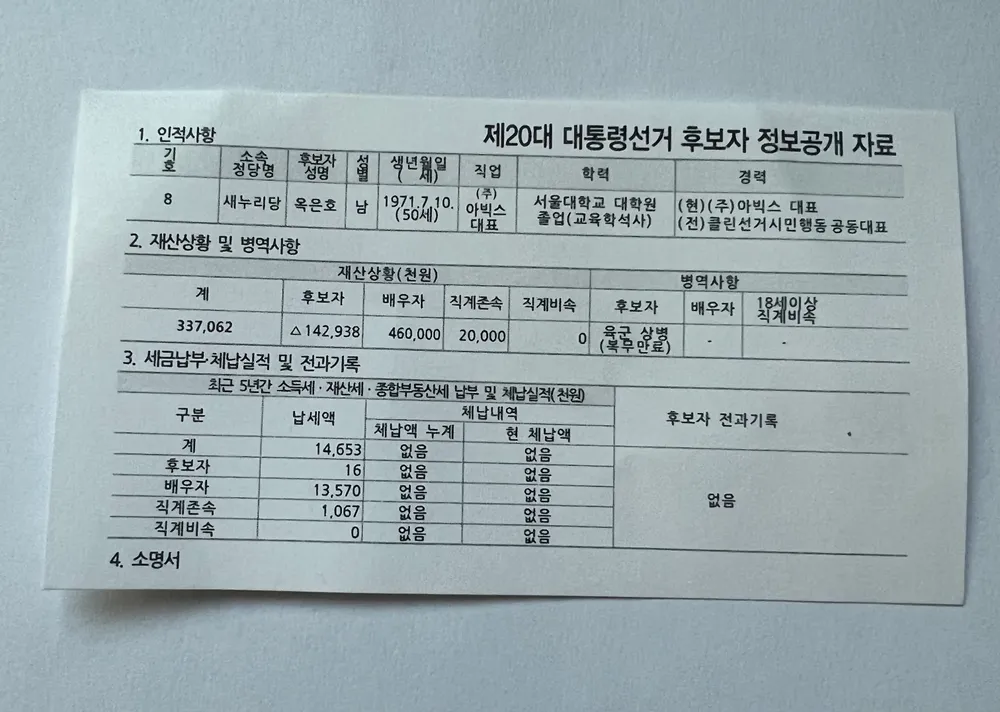 선거공보는 90*50 mm 일반적인 명함 크기로 제작했다. 이 선거공보는 후보자 정보 공개를 하지 않을 경우 중앙선관위가 공직선거법에 근거하여 등록된 후보자 자격을 박탈할 수 있다 주장하여 후보자 정보공개에 필요한 기본적 자료만 적어서 공개한 것으로 역대 대선 후보 중 가장 작은 선거공보이다.  이렇게 제작하고 공보한 이유는 범죄선거 척결 시민 후보 등록과 선거운동에 시민들의 자발적 후원금과 참여로만 진행했기 때문에 한 푼도 허투로 쓰지 않기 위해서로 보인다. 선거공보는 명함 크기로 전국 시군구 선관위 모두에 발송되었으나 선거공보 발송자의 실수나 여러 후보의 공보물과 함께 동봉되어 있어 보지못한 사람도 있을 수 있다.  공직 후보자 정보공개를 주요 지역에만 발송했을 것이라고 왜곡하는 매체가 일부 있으나 허위사실로 모든 선거구 선관위에 후보자 정보공개 공보물이 발송되지 않을 경우 지역 선관위가 문제 제기를 하기 때문에 발송되지 않은 곳은 없다. 또, 대선 후보 현수막에 범죄선거 척결이 가장 중요한 이슈, 문제임을 부각하여 게시하였다.